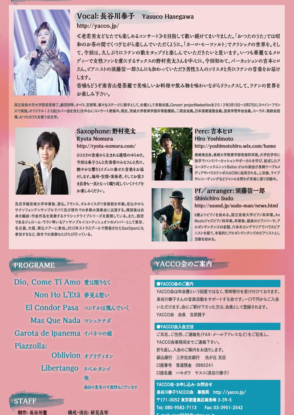 ≪老若男女どなたでも楽しめるコンサート≫を目指して歌い続けてまいりました。「おつたのうた」では昭和のお茶の間でくつぎながら楽しんでいただくように。「カーロ・モーツァルト」でクラシックの世界を。そして、今回は、久しぶりにラテンの歌をタップリと楽しんでいただきたいと思います。いつも華麗なるメロディーで女性ファンを虜にするサックスの野村亮太氏を中心に、今回初めて、パーカッションの吉本ヒロ氏、ピアニストの須藤信一郎氏にも加わっていただき男性3人のソリスタと共にラテンの音楽をお届けします。